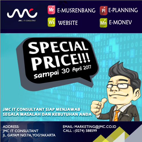Berbekal pengalaman selama lebih dari 8 tahun, JMC IT Consultant telah memiliki beberapa produk e-Government yang siap diimplementasikan. Dan di awal tahun 2017 ini, JMC IT Consultant memberikan SPECIAL PROMO untuk beberapa produk sebagai berikut: